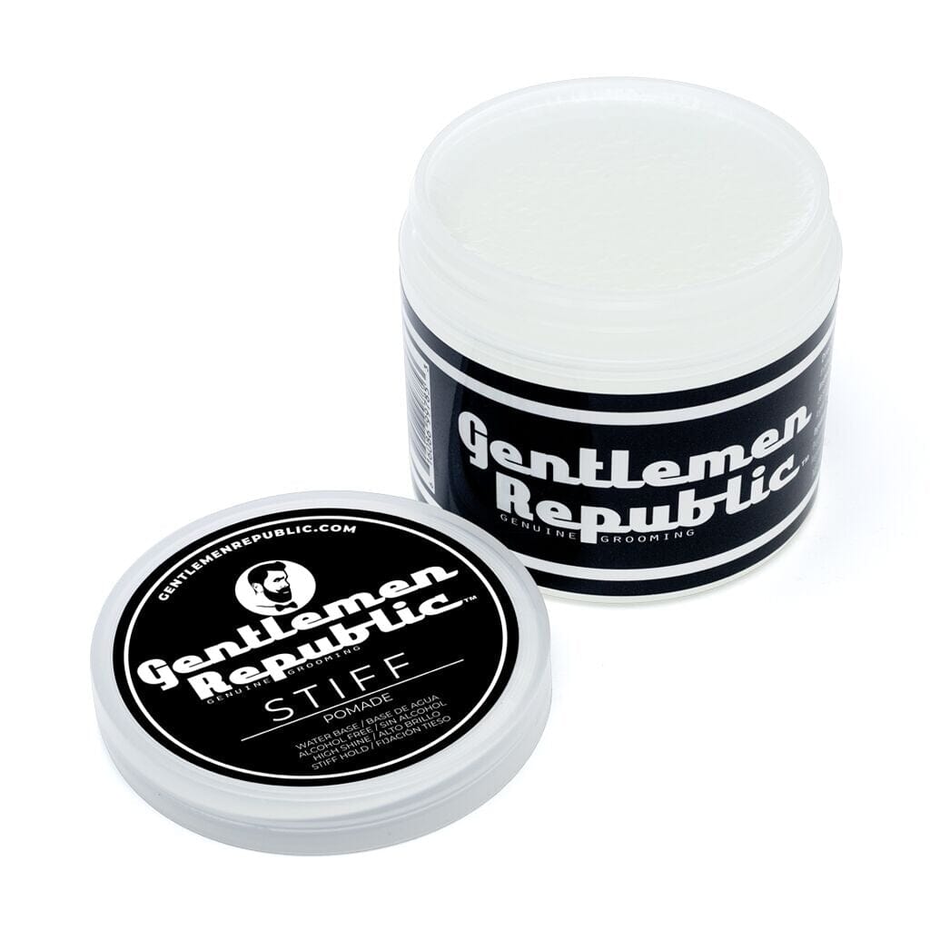 Stiff Pomade- Stiff hold water based pomade with high shine rinses clean and provides all day control. Great for modern styles for the gentleman in you. Not only does it look great applying on your hair, as well designed for great scent.
