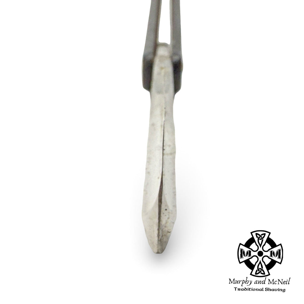 This Böker “The Celebrated” straight razor is a 6/8-inch carbon-steel model from Heinr. Böker & Co., Solingen, Germany. The blade features Böker’s historic Tree Brand emblem and is etched “Baumwerk-Solingen Germany / Alemania” beneath the maker’s mark. The handle is crafted from dark wenge wood, accented with a small inlaid metal tree logo marked “Solingen.” The term “The Celebrated” has appeared on Böker’s premium razors since the early 1900s, continuing the company’s long Solingen tradition of fine hollow-ground blades.
