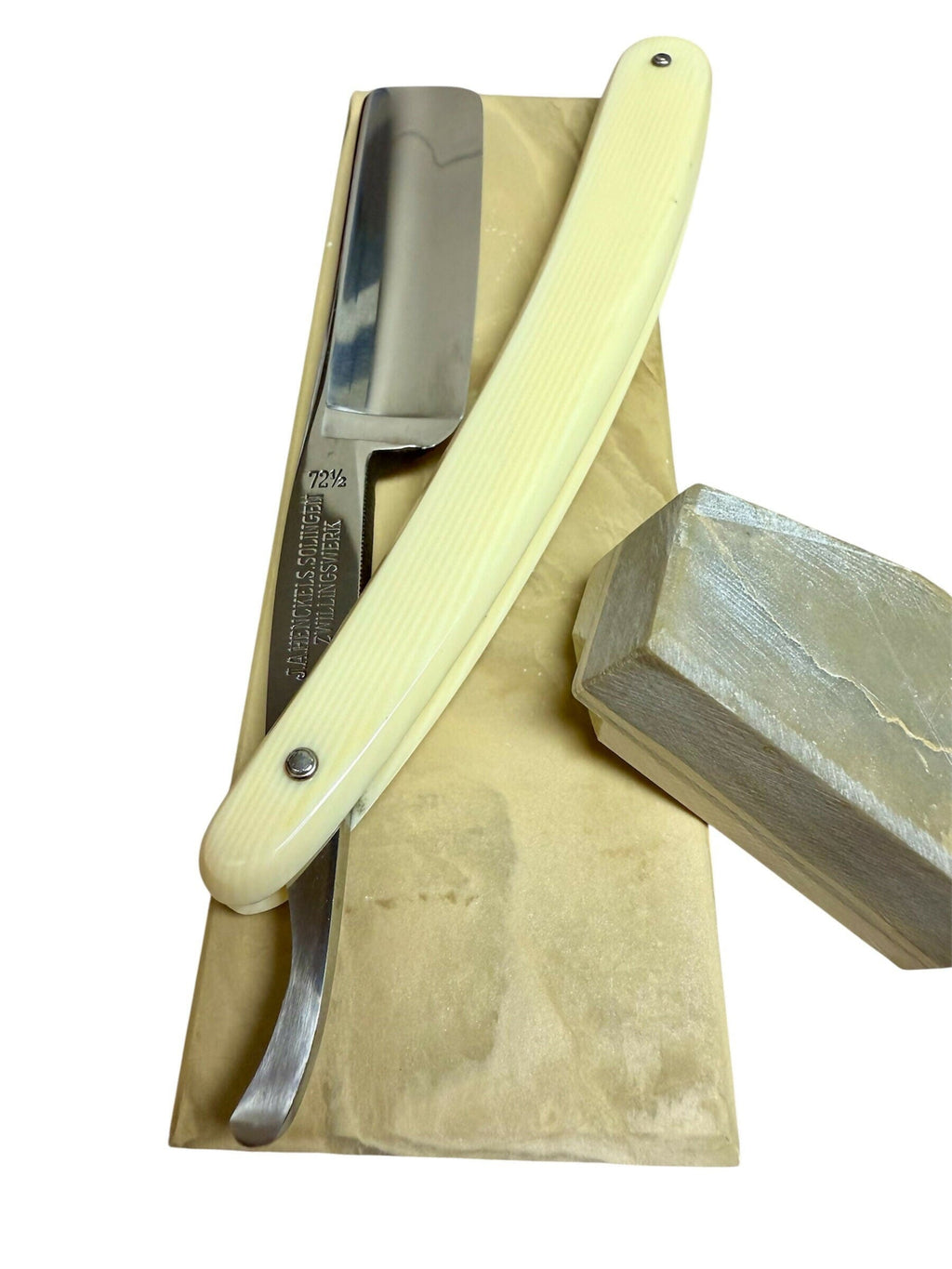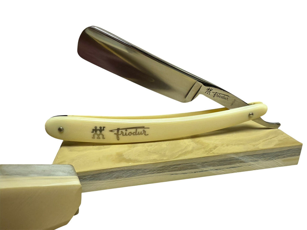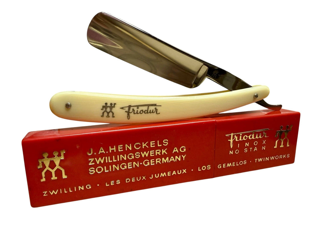 ***Please note this purchase is for razor and matching coffin case only. Stone is only used for reference as to which was used for final finishing. *** This purchase includes a one time free re-honing service for touch ups or a complete re-hone with the final finishing stone of your choice. If you prefer to have me select the stone that can also be accommodated. The blade should remain in good condition. Buyer is responsible for shipping costs to and from. Vintage J.A. Henckels INOX 72 1/2 Full Hollow. Razor is 6/8 in size (spine to edge). Pins are tight and razor closes on these original scales. Razor was sharpened and finished on a Belgian Les Latneuses Coticule natural stone. Razor was taped with a single layer of Kapton tape. Test shaved assuring it has a sharp crisp smooth comfortable shaving edge. Razor has been fully disinfected with Clippercide so it’s ready to be used right out of the box. Razor will be coated in Japanese Camellia Oil protecting the blade during its travels so please be careful when taking it out. Simply wipe off the oil with any tissue, napkin, or cloth. Alternatively you may rinse the blade under warm water right before the shave. No need to strop the razor out of the box before the first shave. It has already been stropped on Kanayama Cordovan Leather. Stay Sharp! |