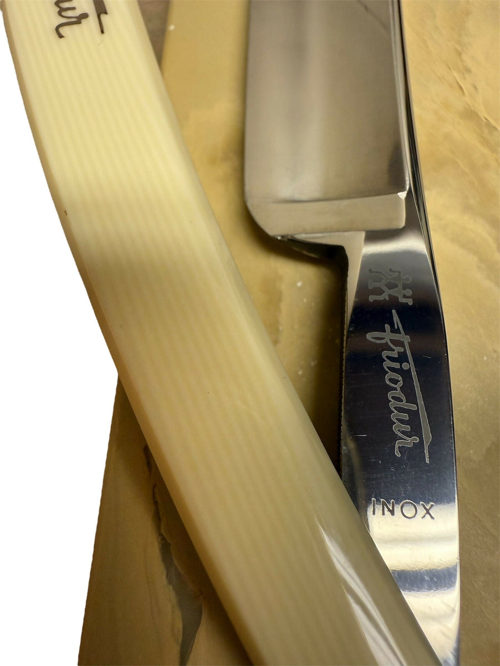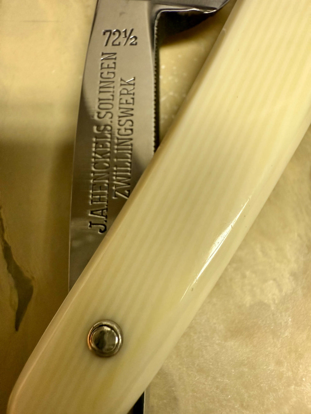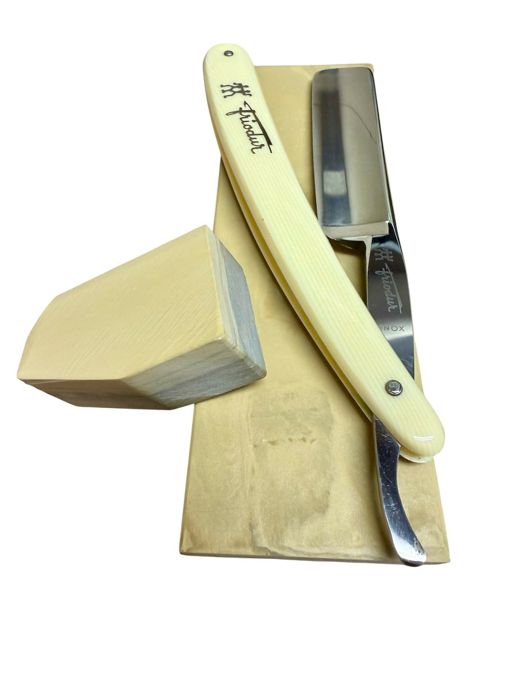 ***Please note this purchase is for razor and matching coffin case only. Stone is only used for reference as to which was used for final finishing. *** This purchase includes a one time free re-honing service for touch ups or a complete re-hone with the final finishing stone of your choice. If you prefer to have me select the stone that can also be accommodated. The blade should remain in good condition. Buyer is responsible for shipping costs to and from. Vintage J.A. Henckels INOX 72 1/2 Full Hollow. Razor is 6/8 in size (spine to edge). Pins are tight and razor closes on these original scales. Razor was sharpened and finished on a Belgian Les Latneuses Coticule natural stone. Razor was taped with a single layer of Kapton tape. Test shaved assuring it has a sharp crisp smooth comfortable shaving edge. Razor has been fully disinfected with Clippercide so it’s ready to be used right out of the box. Razor will be coated in Japanese Camellia Oil protecting the blade during its travels so please be careful when taking it out. Simply wipe off the oil with any tissue, napkin, or cloth. Alternatively you may rinse the blade under warm water right before the shave. No need to strop the razor out of the box before the first shave. It has already been stropped on Kanayama Cordovan Leather. Stay Sharp! |