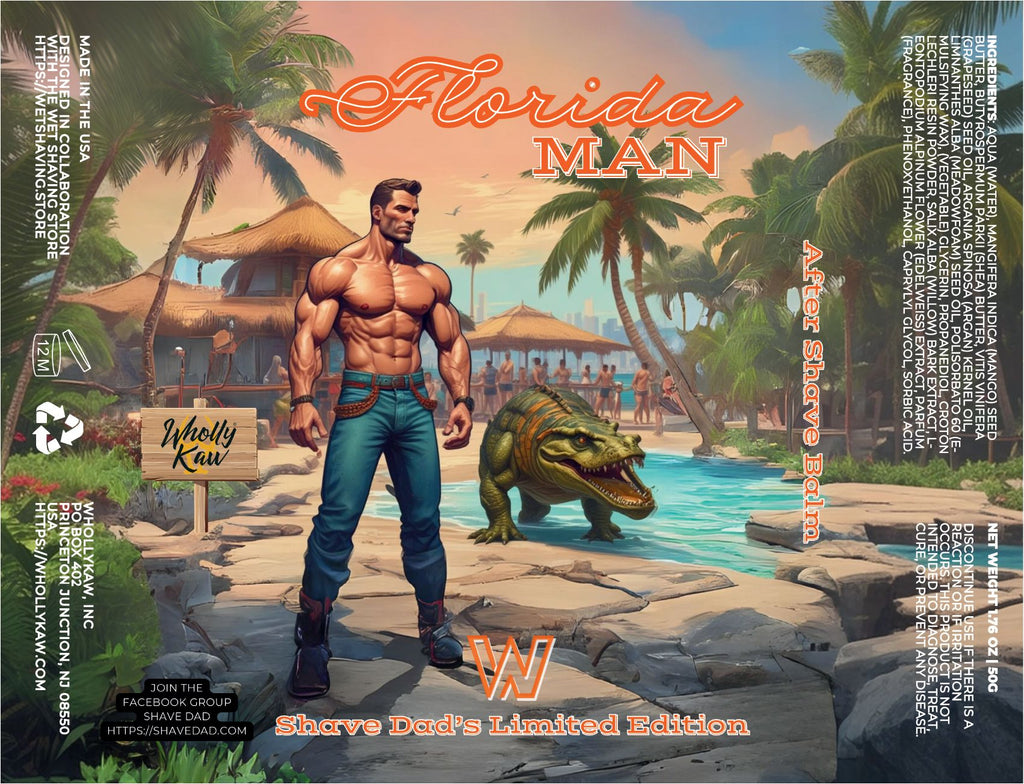 The same scent in the WhollyKaw Florida Man shaving soap in after shave balm.