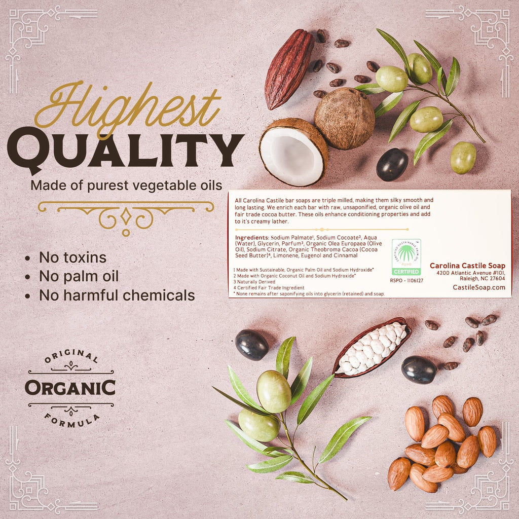 - Go Organic - Treat your skin to the good stuff! Made with organic, responsibly sourced ingredients, your natural bar soap is made with hydrating olive oil, soothing coconut oil, nourishing cocoa butter, and sustainable palm oil.