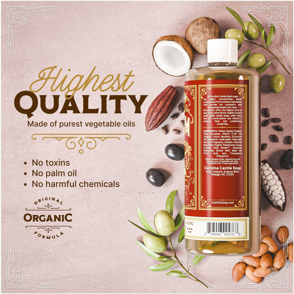Organic Olive & Coconut Oils: Reduce your footprint with our pure castile liquid soap that is made using organic olive and coconut oils & proudly manufactured in the USA; We use only the highest quality plant oils, with absolutely no phthalates, parabens, animal testing, artificial dyes, or foaming agents