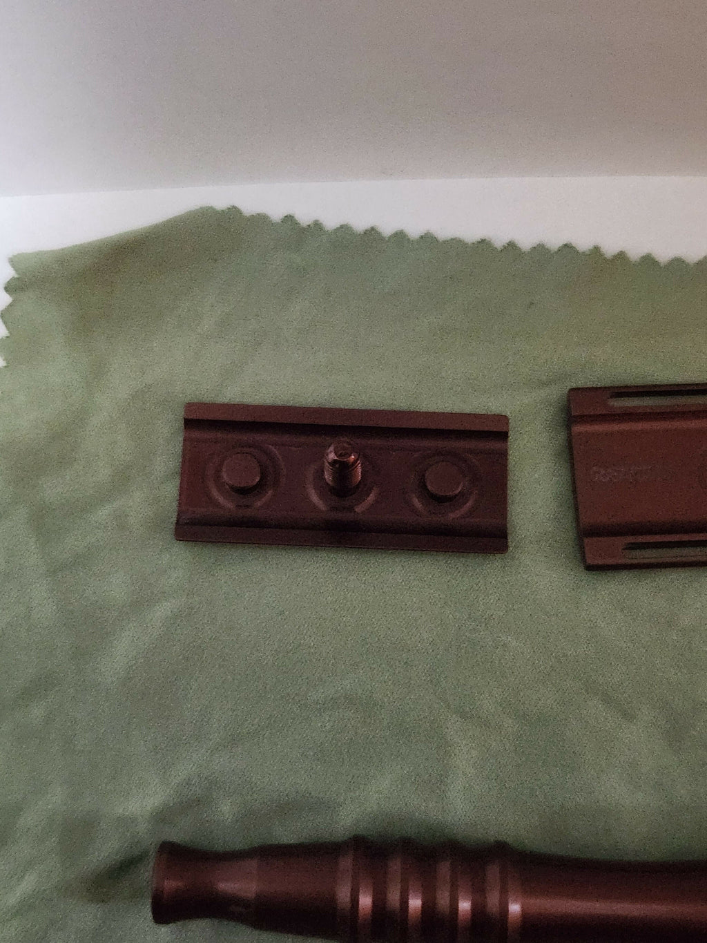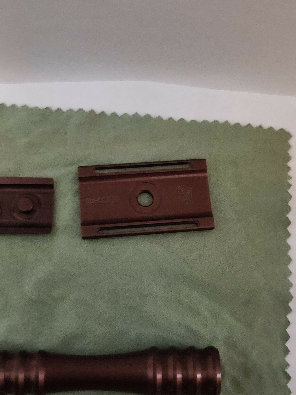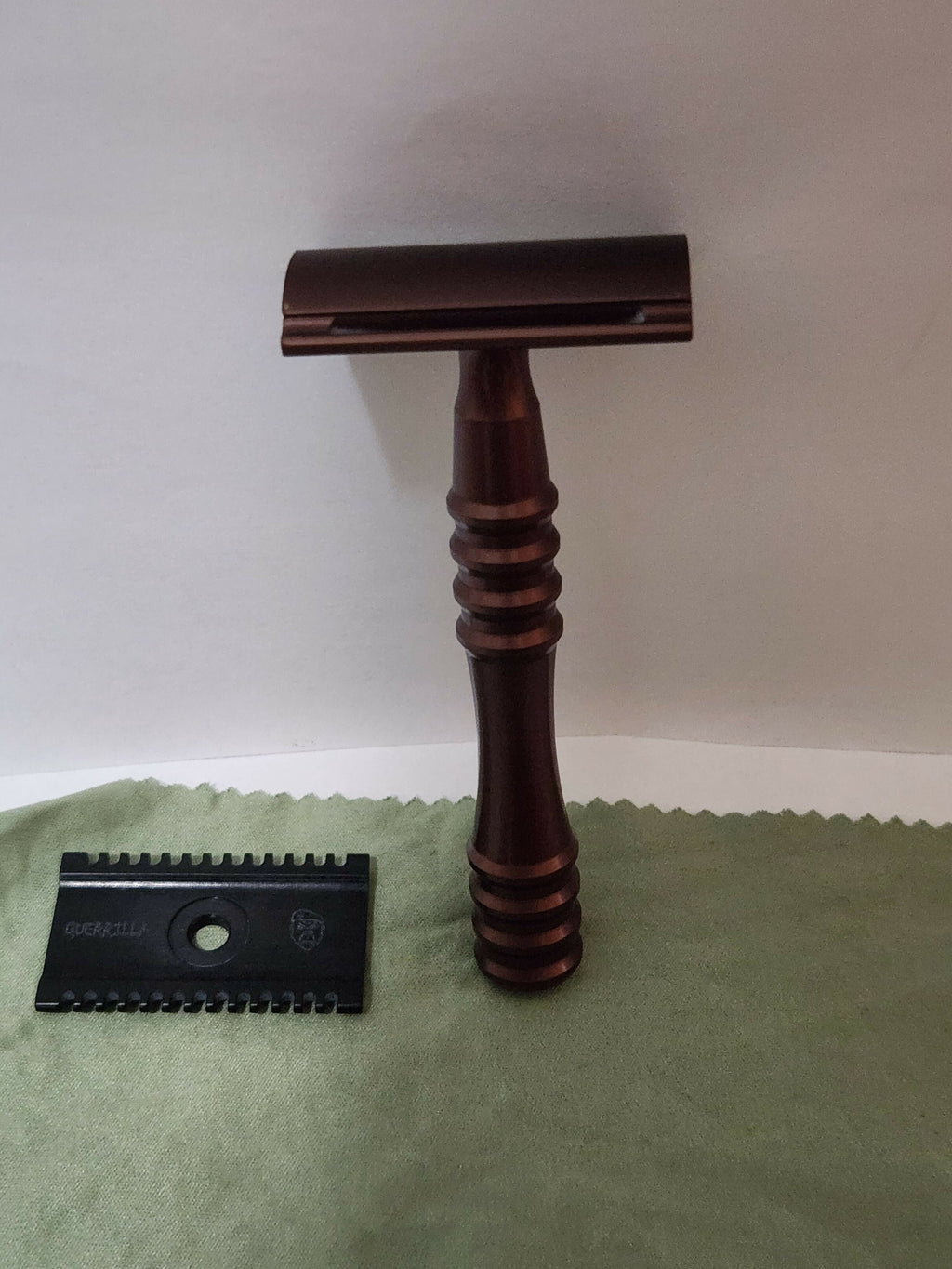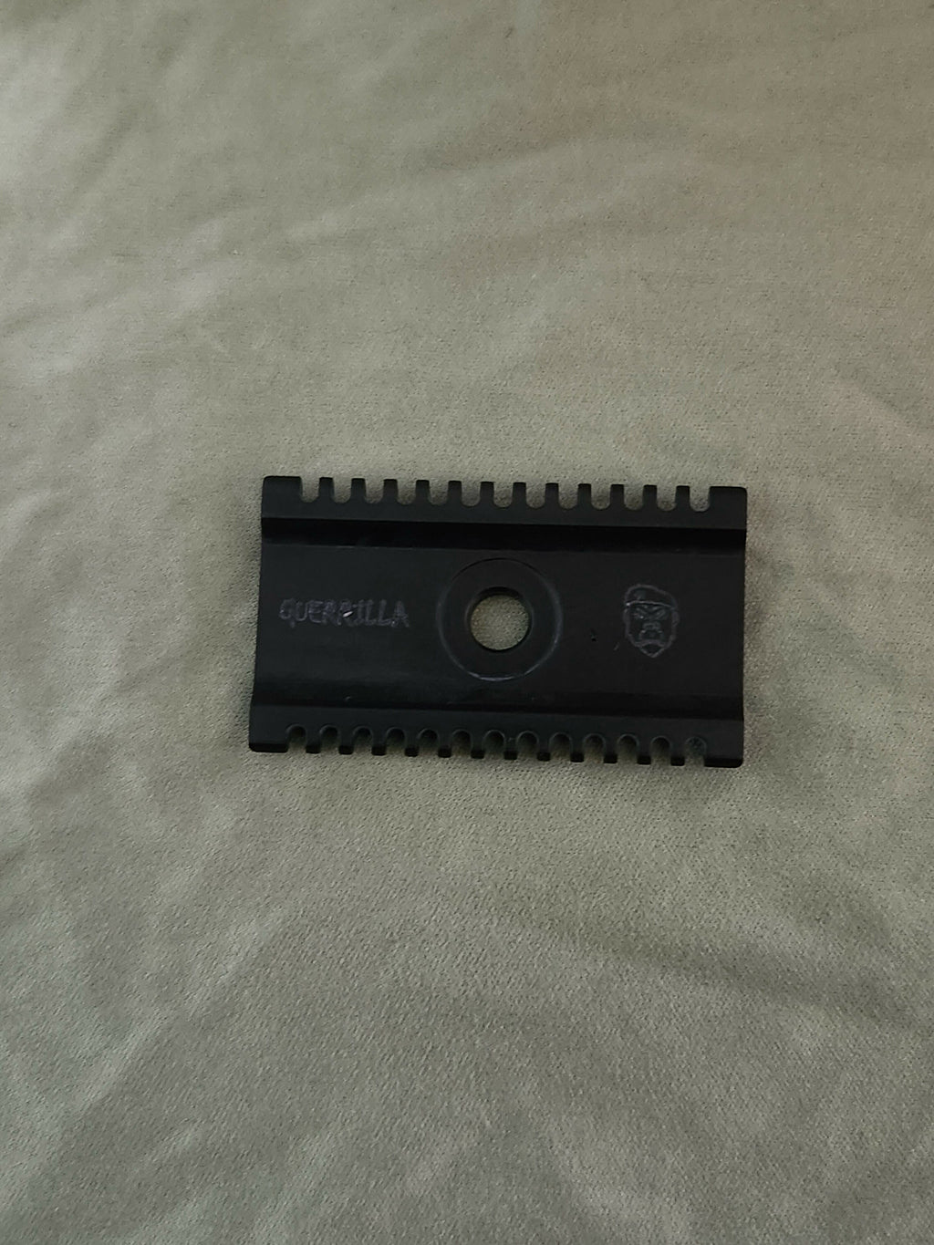 Wolfman Guerilla in Anodized Aluminium. This comes with the .69 Solid Bar plate (in camo brown) and a .84 open comb plate in black. This has the Rebel-style handle (Camo Brown). Used only around 7-8 and comes with the original cloth as well. In excellent shape, and please review the pictures. Thanks again