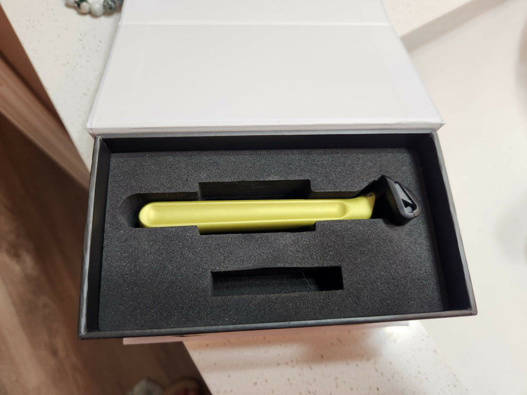 This was a collaboration between Ridge Wallet and OneBlade. It is no longer available. It is pretty much the OneBlade Element with a black PVD coating on the head and a Hyper Lime handle instead of the colors OneBlade normally offers with Ridge branding. This is not made anymore. I ordered a different color and am deciding to let this one go. It has been used 12 times give or take a couple.